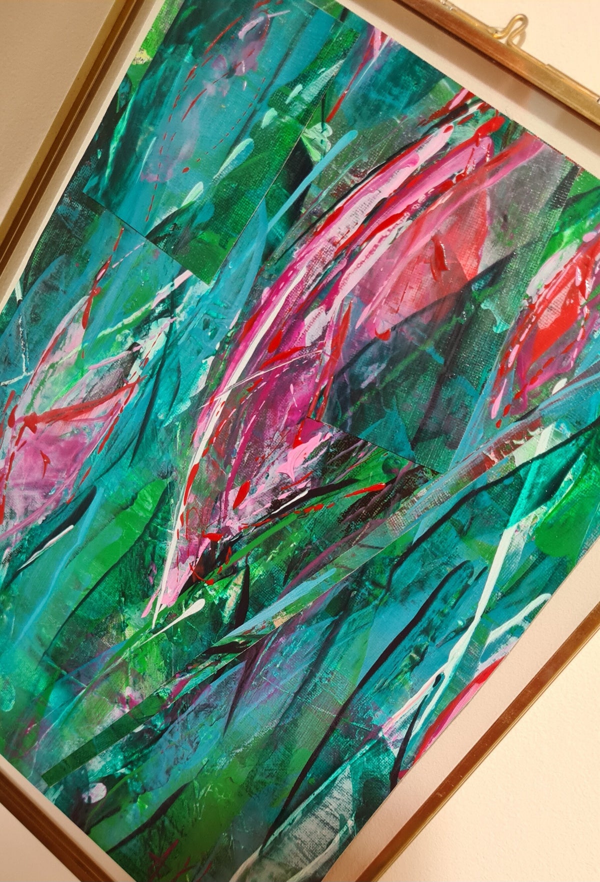 Acrylic paint on canvas in double glass floating frame with brass edge. Ready to hang. 🌷